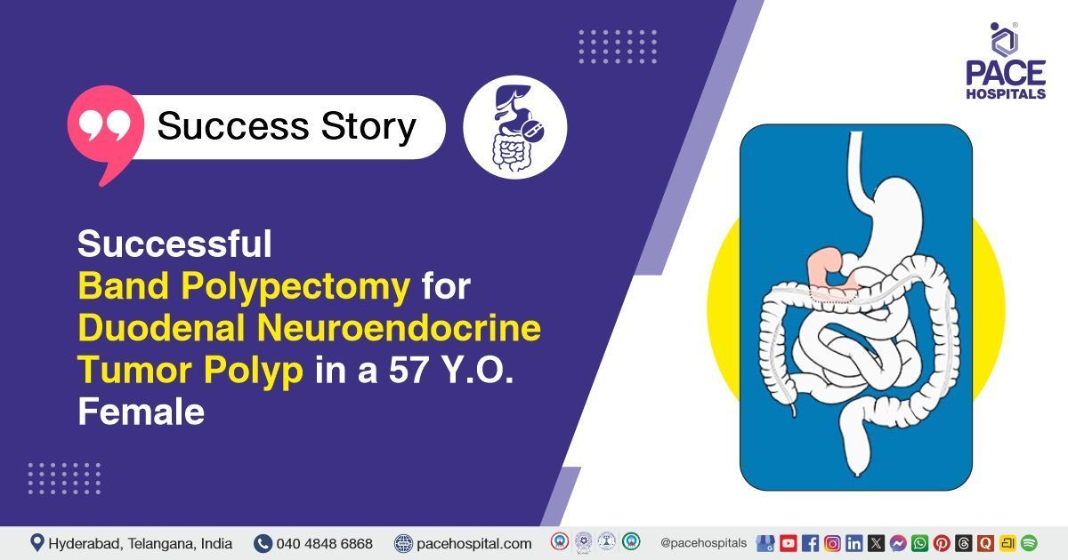 PACE Hospitals’ expert Surgical Gastroenterology team successfully performed a Band Polypectomy on a 57-year-old female patient diagnosed with a Duodenal Neuroendocrine Tumor (NET) polyp. The aim of the procedure was to achieve complete endoscopic removal of the polyp and to prevent disease progression while avoiding the need for invasive surgery.