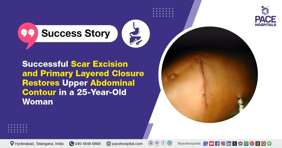 PACE Hospitals' expert Plastic and Reconstructive Surgery team successfully performed Scar Excision and Suturing on a 25-year-old female patient who presented with deformity and a tight scar over the upper abdomen secondary to previous surgery. The procedure was performed to remove the contracted scar tissue, restore abdominal contour, and improve the patient's appearance and comfort.